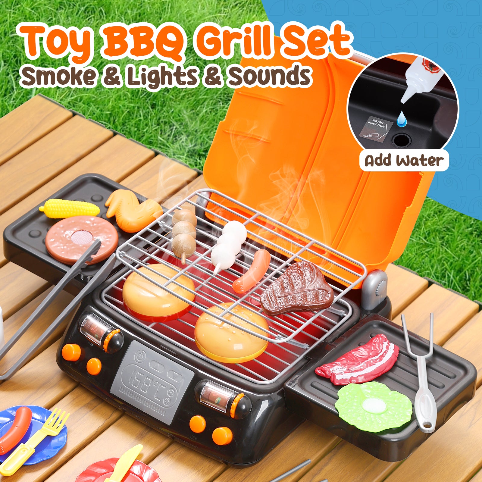 - [Realistic Barbecue Experience]: By adding water, the barbecue stove will emit mist, simulating pretend steam and sound and light functions, adding a touch of realism to their role play game and making your little chef even more excited. They can enhance their imagination and creativity by cooking up delicious meals with their friends.
