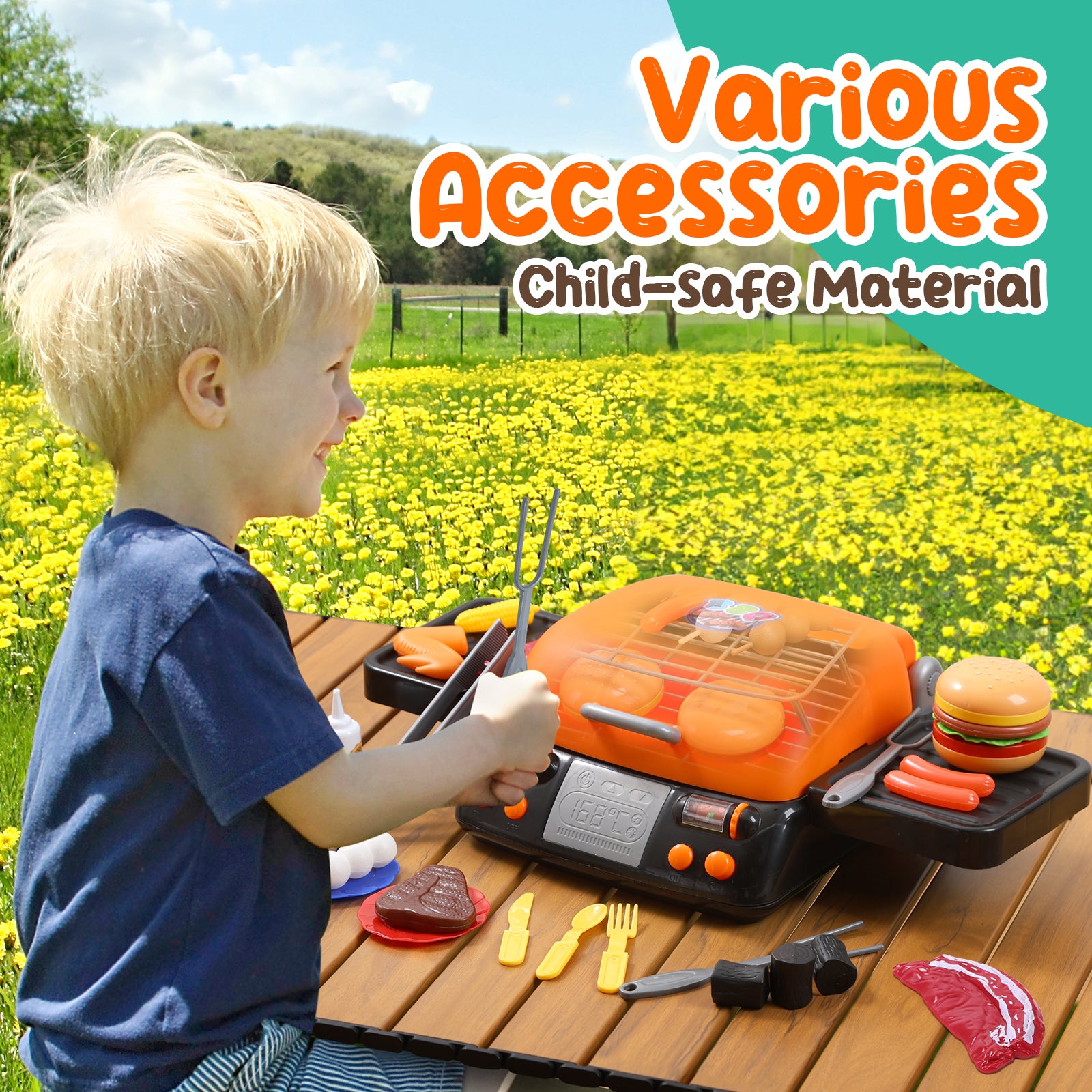 - [Child-safe Kitchen Toys]: With the included play food and toy bbq accessories, children can develop their fine motor skills as they handle and grill the play food. The kids grill playset is made of quality ABS plastic, featuring smooth edges and emitting no unpleasant smells, ensuring both safety and durability.