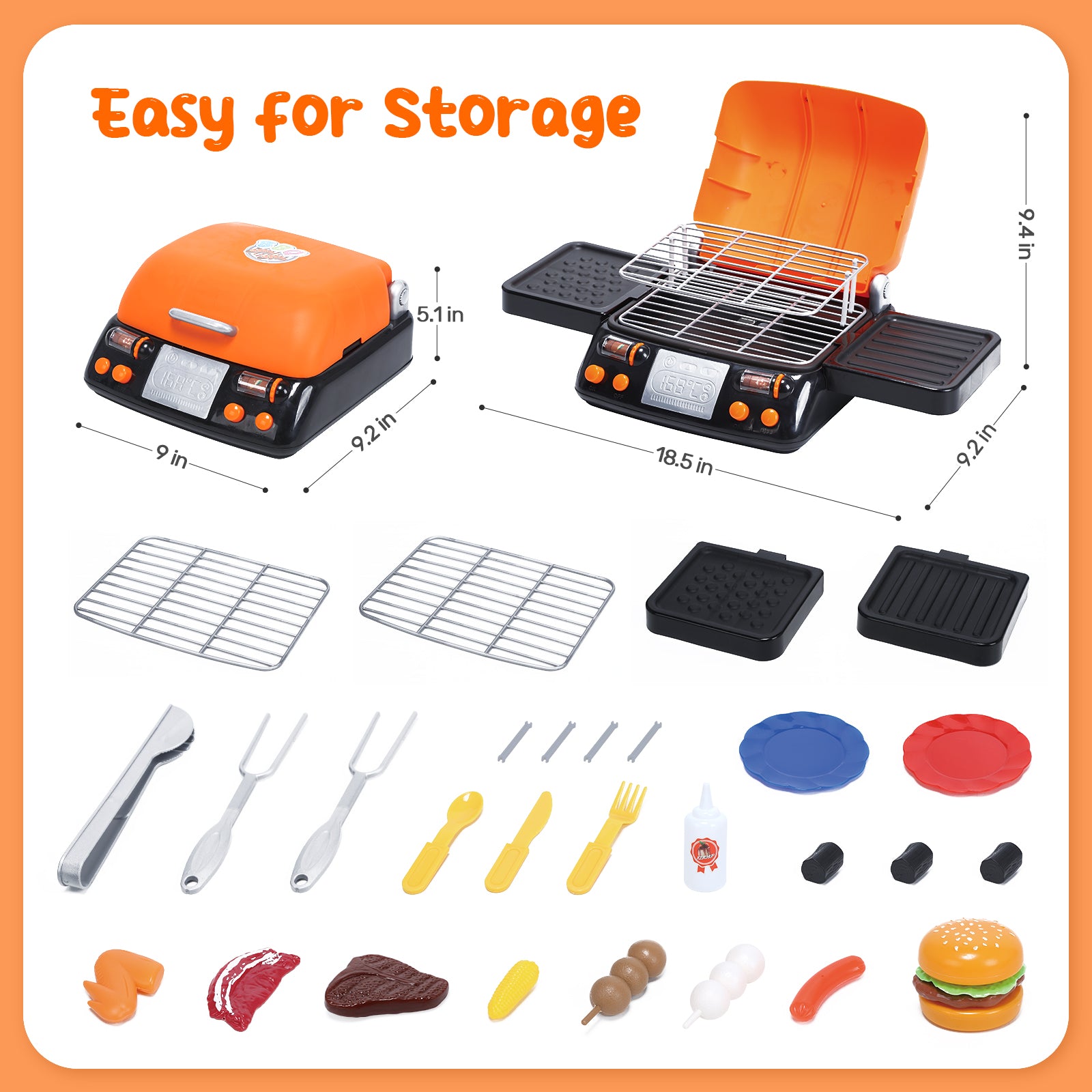 - [Easy to Assemble and Store]: The toy bbq playset is easy to assemble, and all the kitchen toys can be conveniently stored inside the BBQ grill itself, eliminating the need for additional storage containers. Perfect for indoor and outdoor cooking and pretend play, allowing kids to enjoy barbecue fun wherever they go. Product Size: 18.5 in * 9.2 in * 9.4 in