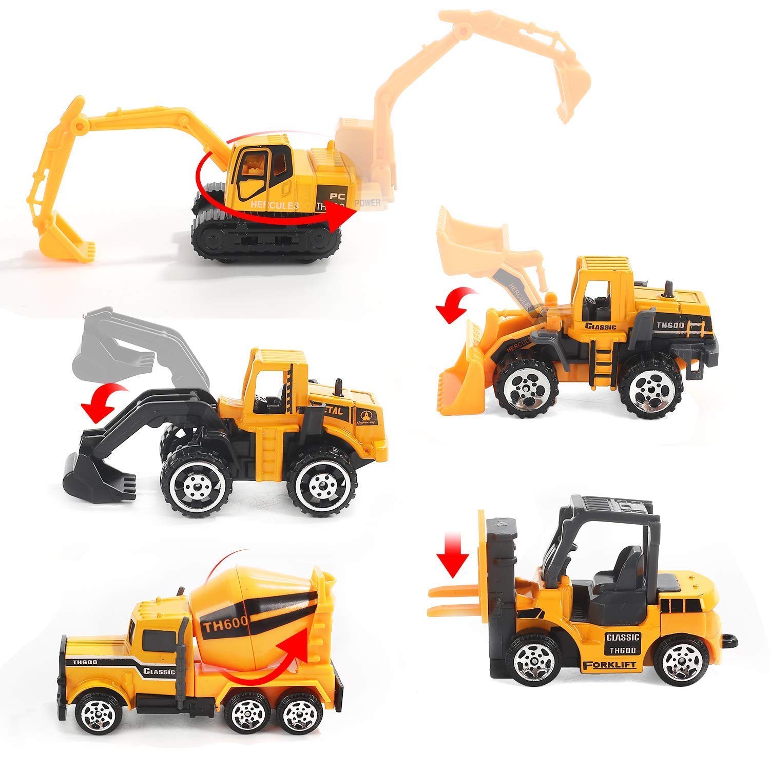Interactive Movable Parts: Each vehicle has fully functional parts — the excavator’s claw lifts, the dump truck tilts, the roller rotates — just like real construction machinery.