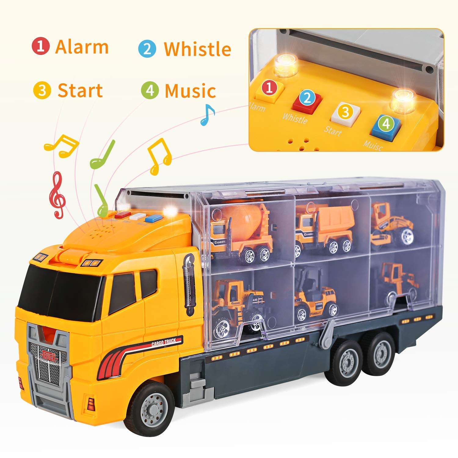 Realistic Sound & Light Effects: Features 4 buttons on the trucks to trigger engine sounds, horns, alarms, or music with synchronized flashing lights for immersive play.